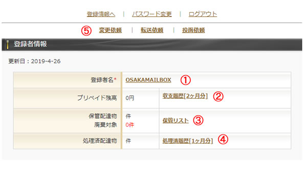 ③ 配達物保管:現在お預かりしている配達物のリストです。2ヶ月を超える保管物は廃棄処理(要費用負担)の対象となります。